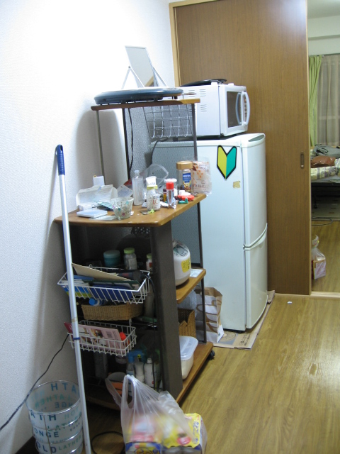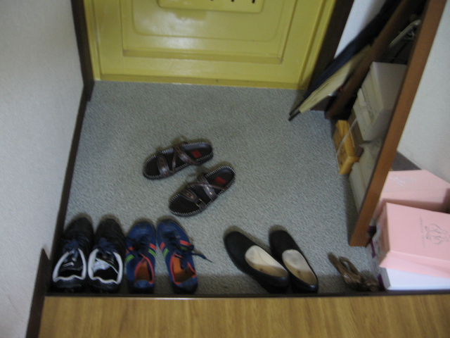 相変わらずテレビ台はダンボールです。 流し台(?)には今日飲み終えた黒糖焼酎と、レトルトのハヤシが。コンロにはやかんが。 いかにも調理に使っていないって感じだなあ 手前の、なんだろ・なんていうの?収納ケース(とは言わないか)には炊飯器が載っています。帰省から帰ってきてから働かせていません。 その上には毎食後や就寝前に飲む薬がバラバラ置かれています。 ここの灯りは、点けると自動的に換気扇が動き出す(不満その2)。 換気扇が動いている間お風呂場の電気が点いている、というのがもったいない。 おそらく、そろそろ私は換気扇のみ作動させるときは電球を抜き始めると思う。 休みの日の主戦力はサンダルです。 知り合いがたくさん見るmixiには恥ずかしくて載せられませんでした。