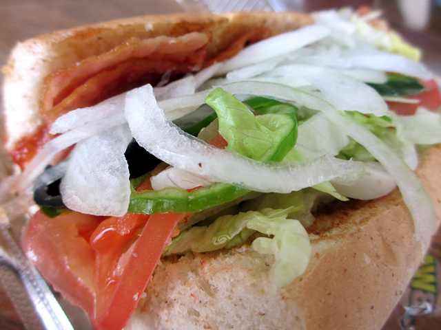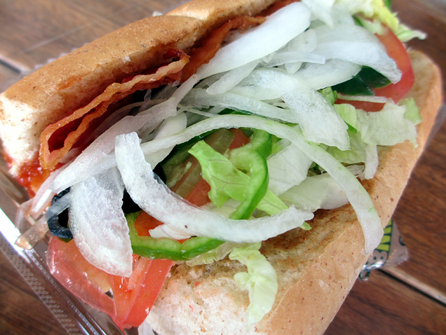 ん?じゃあスパイシーメキシカンを得サブで食べられるのは今日(12/3)が最後じゃねーか!ランチはSUBWAYに決定! ベーコンとクリームチーズ、ホットペッパーのサンドイッチです。 そっかー、スパイシーメキシカンってクリームチーズが入ってたのか!(チーズ好き) すごく、もったいないことした。もっと食べておけばヨカタ。 ドレッシングはおすすめのチリトマトソース。 ホットペッパーも効いてて、すごくおいしい。ああ、もっと食べておけばよかったと食べながら何度も思いました。 (いえ、レギュラメニュウにはありますので。食べればいいじゃん) 得サブリニュアルでチーズが入った得サブがないのがちっちっち! ポテト&チーズ(旧得サブで水曜メニュウ)の食べ納めができなかったのも無念ですぅぅ。 <だから、メニュウには残ってるっての。タイトルも「食べ納め」って・・・(苦笑) 【今日のメニュウ】 スパイシーメキシカン(320円)ブレッド:ウィート(トースト) トッピング:なし ドレッシング:チリトマトソース 野菜すべて多め、ホットペッパー追加 ベジーデライト(290円) ※写真なしブレッド:ハニーオーツ(トースト) トッピング:なし ドレッシング:バジルソース 野菜すべて多め
