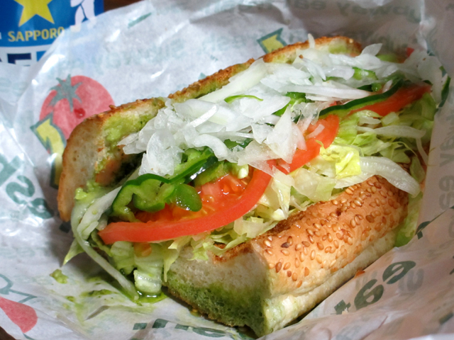 15日、久しぶりにSUBWAYを食べて(日記)、思ったこと。やっぱりうまい。←今更ww SUBWAYづいてしまい(てへ!)、翌16日も夕食でいっただき~~ えびアボカドです! ブレッドはセサミ、ドレッシングはバジルオイルだよ。 もちろんブレッドはトースト。 野菜全部多めでお願いしました。 アテンダントさんが「(野菜の量は)これくらいでよろしいでしょうか」と笑顔で聞いてくれて 私もその野菜の量に思わず笑顔になりました。「ありがとうございます」とうれしさいっぱいの声で答えました。 ゆめタウン三豊店でテイクアウト。 今日のお供はアルコル!(いつもはオールフリーなんだけどーー) お持ち帰りの宿命でドレッシングがブレッドに浸ってる;; でも、バジルオイル好きだからいいのだww バジルとえびって合うでよ。バジルとアボカドの組み合わせも私は好き。 (えびアボカドのおすすめドレッシングはわさび醤油で、それも好きなんだけど、バジルのほうが好きです) あと、ブレッドはどれもトーストしたほうがうまいけど、セサミは特に!セサミの香ばしさ増し増しになるからね!!