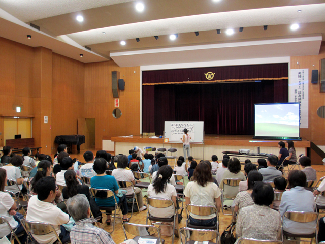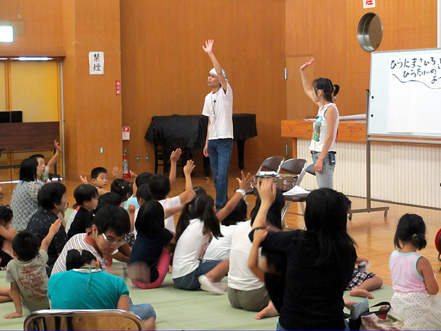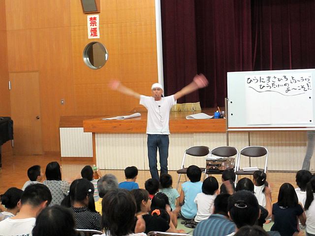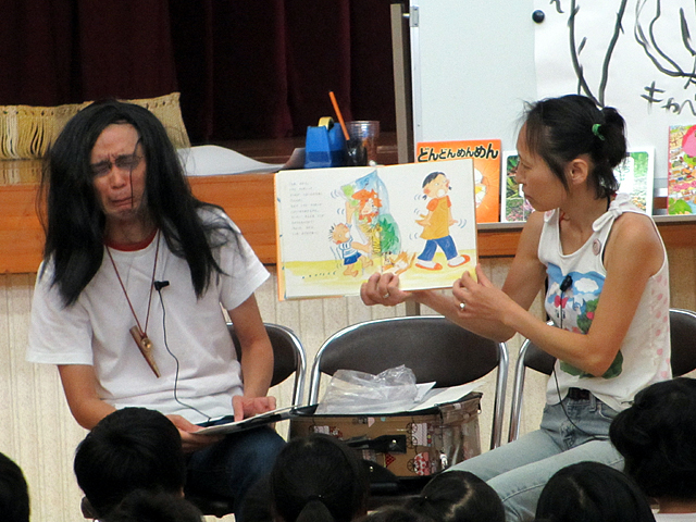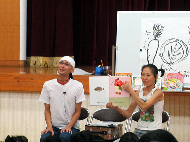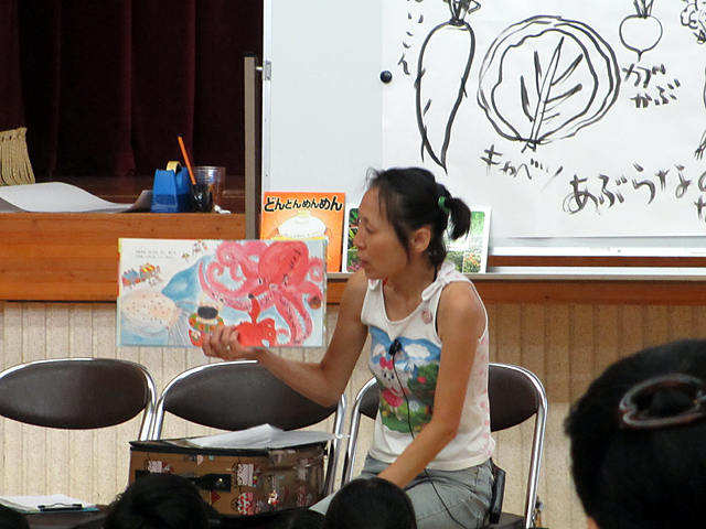 絵本作家の平田昌広さん、景さんご夫婦に来ていただきました。 (「来ていただきました」って私は何もしてない) 職場の人たちが会場準備に出ている間、私は図書館業務を引き受けたッ(いつもやってることです)。 講演会が始まる13:30はちょうど忙しい時間帯だったのですが(回送便がくる) 14:30からの絵本ライブだけはどうしても見たい!と図書館をバイト2人に任せて見に来ました。 お客さんもいっぱい! 子どもたちはゴザを敷いて座ってもらいました。 ―新作『だんごうお』です 平田景さんだけのよみきかせもありました。―『それいけ!ぼくのなまえ』 ちょっと早口でした。 おかん役を昌広さんが。―『おかん』 あっというまの30分でした。 早口言葉やクイズ(景さんが野菜の絵を描いて、それを当てさせる)に子どもたちはノリノリでした。 あと、ウィッグ(かつら)つけた昌広さんにも大うけ。子どもらってやっぱりベタなものが好きなんだなぁ。 (いえ、私も笑ってました) 私が会場を出ていく頃、「アンコール」の声が聞こえていました。 片付けのために17時前会場に行くと、うどんやに行く間際(館長による接待)のご夫婦と会うことができました。 景さんめっさ細い。そんでふたりともスゲー若い。 もっとおおらか~な人たちを想像していたのですが、すごく一生懸命でひたむきな感じのするお二人でした。 これからもっと活躍し、活動の場を広げていくんだろうなー。楽しみです。