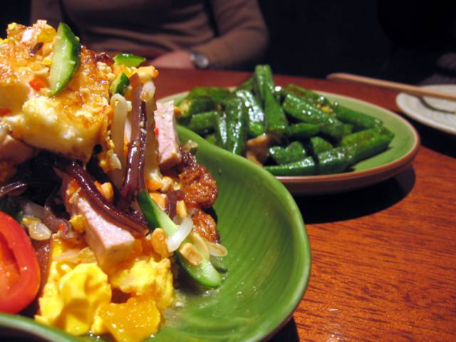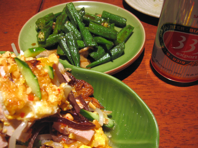 タイ風目玉焼きのサラダ オクラの炒め物、333~バーバーバー~(ベトナムのビール) 渡り蟹とアボカドのベトナム和え グリーンカレー パッ・タイ(タイ風焼きビーフン)